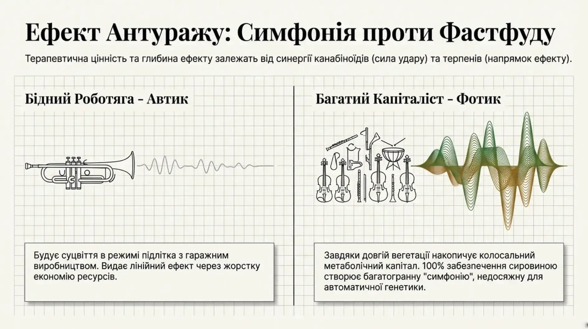 Сложность продукта Линейная: из-за дефицита GPP выбирает либо “мощь”, либо “вкус” Симфоническая: ресурсов хватает на полный ансамбль каннабиноидов и терпенов