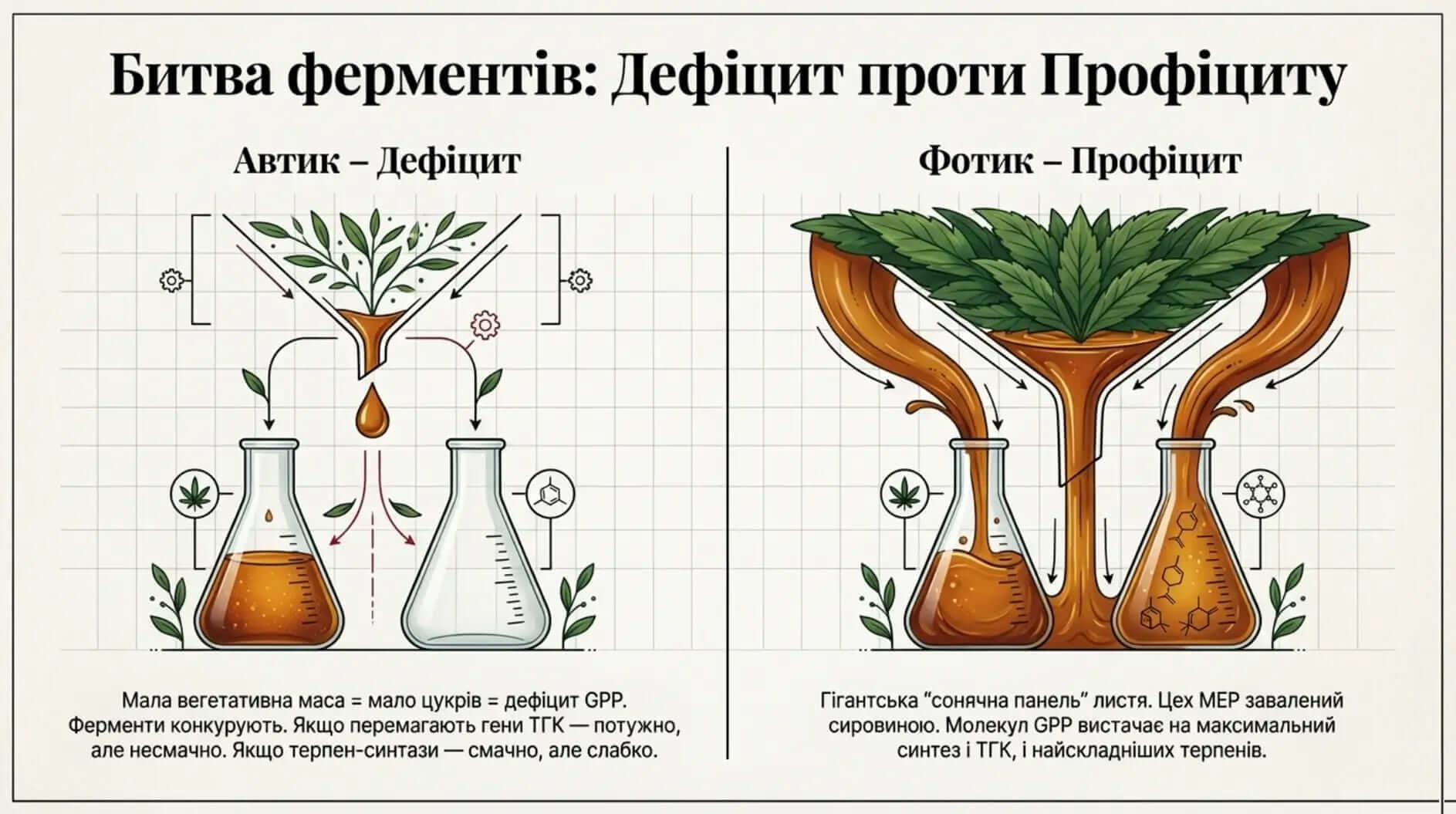 Фотопериодное растение за время длинной вегетации выстраивает огромную “солнечную панель” из листьев. Когда начинается синтез смолы, его конвейер завален сырьем (сахарами) до отказа. Автики же редко могут похвастаться пышной структурой, поэтому в период цветения их “цех” MEP испытывает дефицит сырья, что закономерно приводит к ограниченному производству GPP.