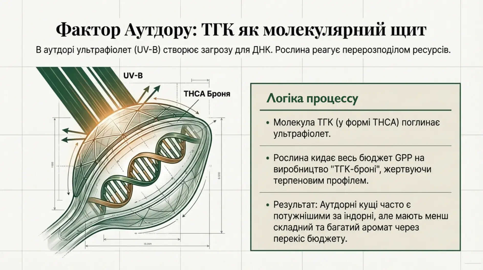 Молекула ТГК (в форме кислоты THCA) способна поглощать ультрафиолетовое излучение, особенно в спектре UV-B. В аутдоре, где солнце “жарит” нещадно, растение чувствует угрозу для ДНК будущих семян. В ответ оно бросает все ресурсы GPP на производство ТГК-брони. Трихомы работают активнее, производя больше CBGA, чтобы создать защитный слой. Именно поэтому аутдорные кусты часто мощнее, но из-за “перекоса бюджета” в сторону каннабиноидов их аромат может быть менее сложным, чем в тепличных условиях. В индоре, если не используются специальные UV-досветы, этот стимул отсутствует и поэтому чаще получаются ароматные и вкусные соцветия, но толку от них маловато.