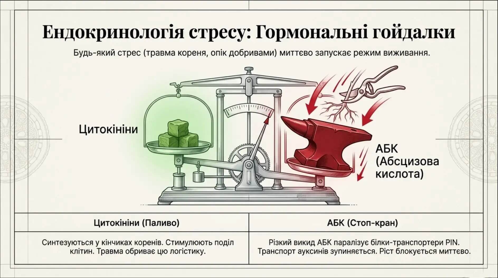 Ситуация становится фатальной при повреждении корневой системы. В кончиках корней синтезируются цитокинины – главные стимуляторы роста растения. Травма корня обрывает эту логистическую цепочку. Растение оказывается в двойном капкане: АБК активно “давит на тормоз”, а дефицит цитокининов лишает “двигатель” топлива.