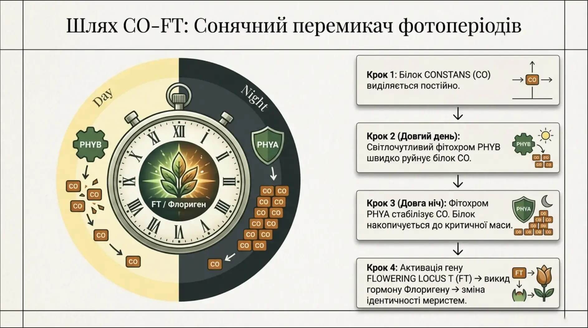 Как уже сказали выше, белок CO необходим для активации гена цветения FT . Он выделяется постоянно и синхронно с фитохромами строго по циркадным ритмам . Пока день длинный, этот белок постоянно разрушается фитохромом PHYB . Когда ночь становится длиннее, PHYB выделяется в меньшем количестве и не успевает разрушить CONSTANS . Одновременно с этим выделяется больше фитохрома PHYA , который наоборот стабилизирует CO и даже стимулирует его синтез. Когда концентрация CO достигает критической, он активирует ген цветения FLOWERING LOCUS T.