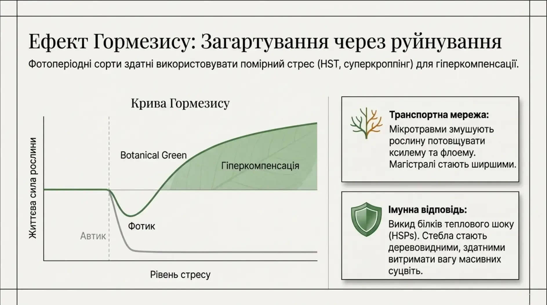 Фотопериодные сорта способны использовать механизм гормезиса – это явление, при котором умеренный стресс вызывает защитную реакцию, превышающую по силе сам вредный фактор.