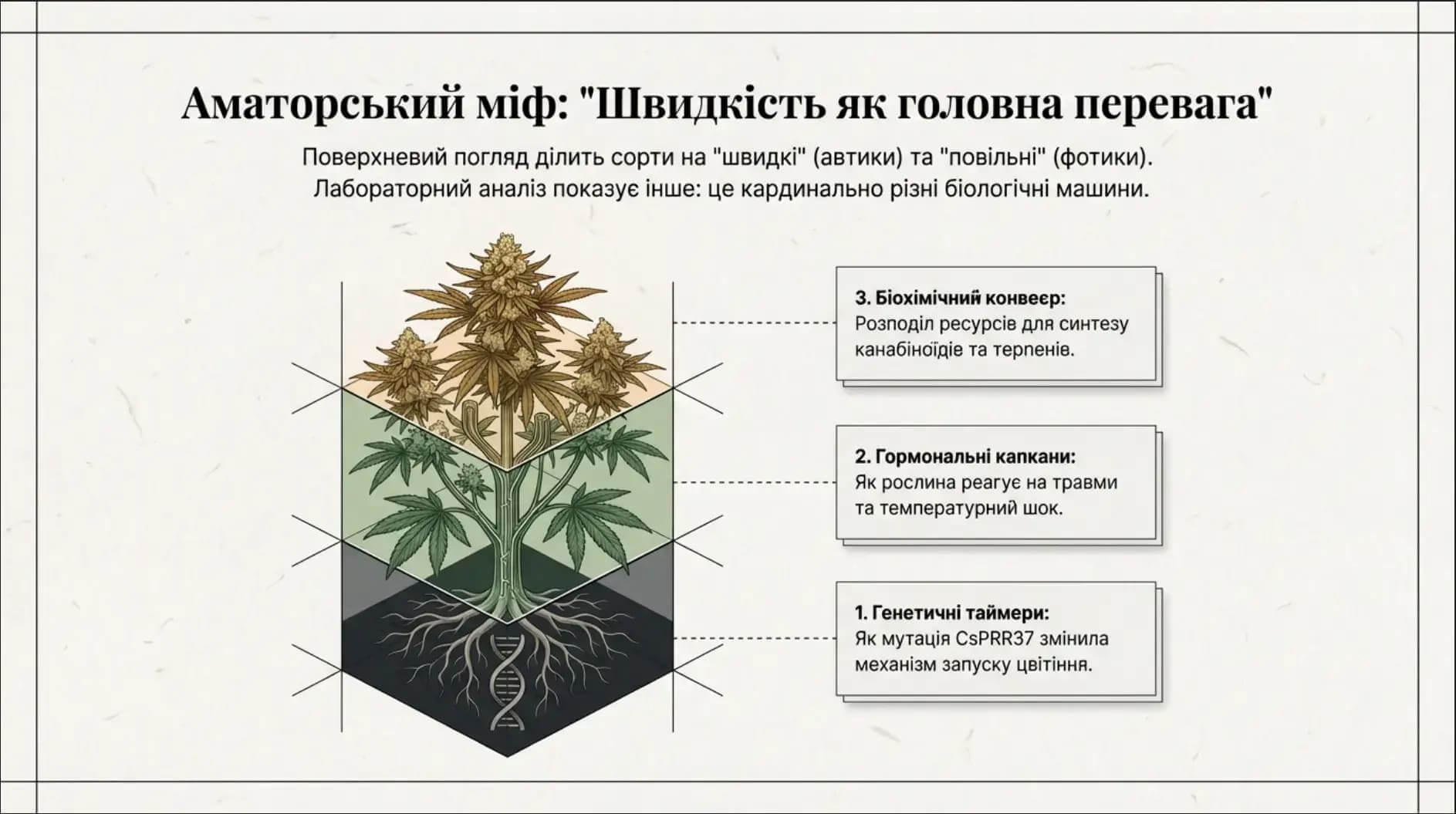 Главное отличие автоцветущих от фотопериодных типов каннабиса заключается в мутации гена CsPRR37 у автоцветов. Это изменяет механизм запуска цветения: фотики ожидают длительных ночей для активации “ пути CO-FT ”, а автики строго подчиняются внутреннему биологическому таймеру - путь miR156-SPL . Это ключевое отличие оказывает критическое влияние на продолжительность жизненного цикла, устойчивость к стрессам и качество полученного урожая! Поверхностный взгляд на данную тему приводит к ошибкам, в результате которых гроверы теряют время, деньги и грустят в ожидании следующего сезона! Чтобы помочь вам избежать таких ошибок, мы покажем вам в этой статье, что на самом деле происходит “под капотом” у автиков и фотиков.