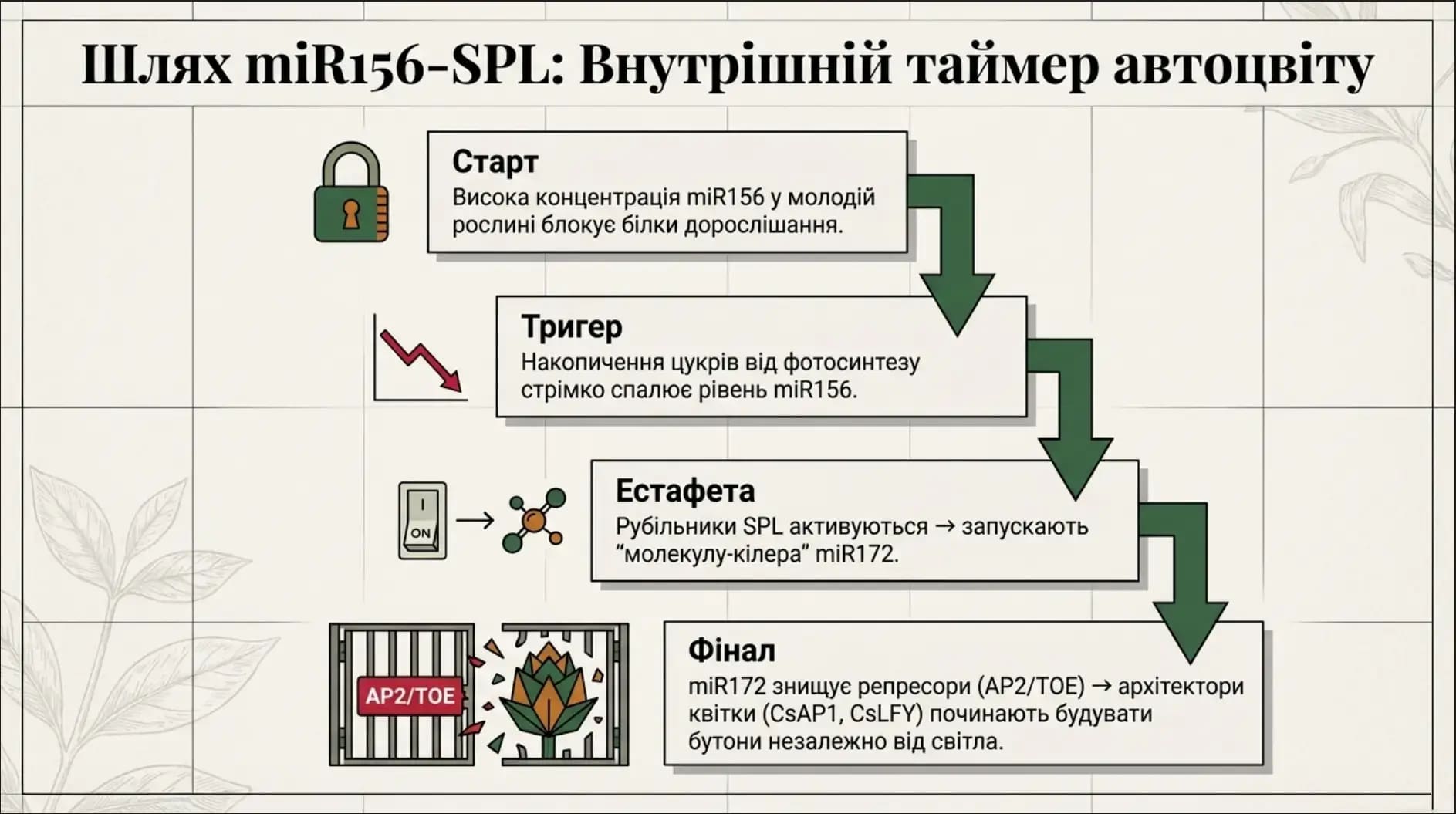 Автоцветы зацветают по достижении метаболической зрелости из-за поломки функции гена CsPRR37 – важнейшего компонента внутренних циркадных ритмов растения. Эта мутация сломала привычный путь CO-FT , вместо которого автики используют “внутренний таймер” – путь miR156-SPL , где накопление сахаров в листьях отключает генетические “блокираторы” цветения. Этот процесс представляет собой изящную генетическую эстафету, в которой берут участие: