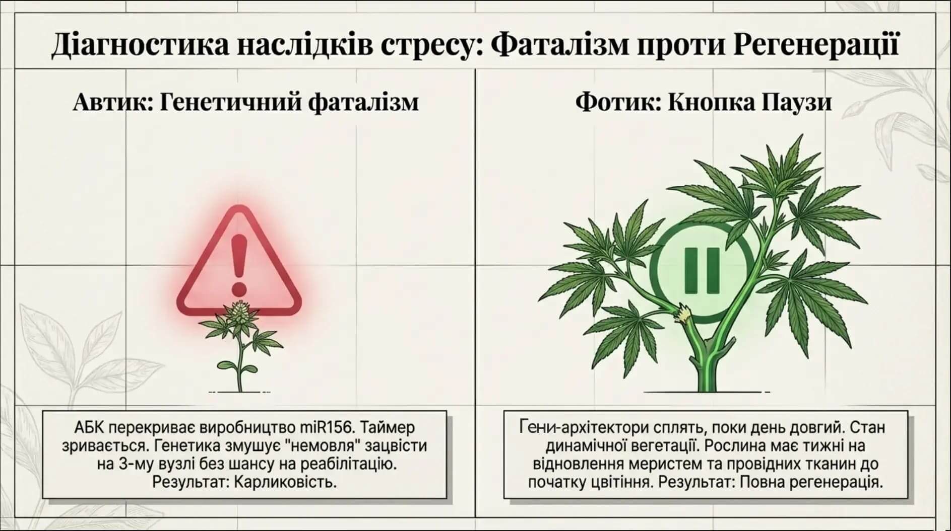 Право на ошибку Нулевое: стресс (ABA) не останавливает таймер miR156 – риск “карликовости” Высокое: фаза вегетации длится столько, сколько нужно для реабилитации