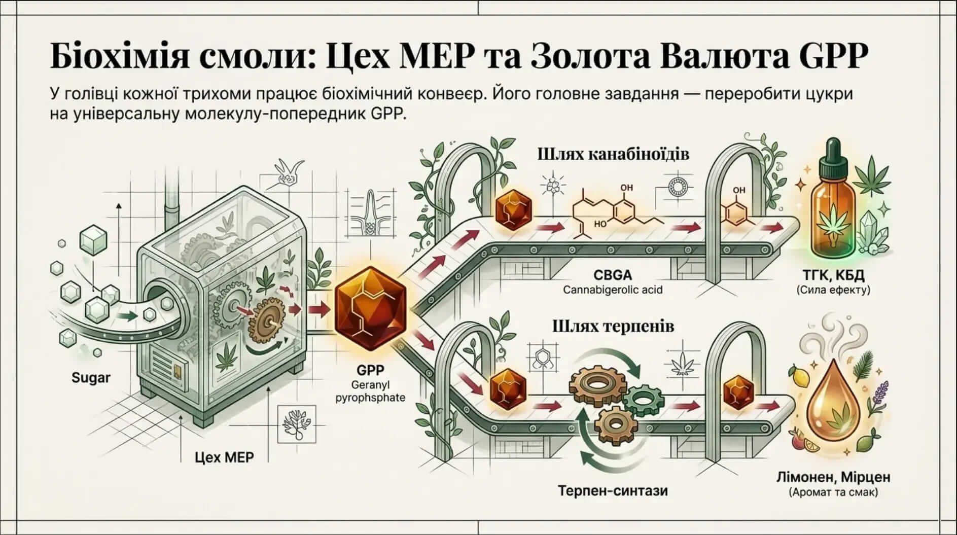 Внутри каждой головки трихомы работает биохимический конвейер – путь MEP (метилэритритол-4-фосфатный путь). Этот конвейер перерабатывает продукты фотосинтеза в универсальную молекулу-предшественник – GPP (геранилдифосфат) . GPP – это “магистральный узел”. У него есть два главных пути:
